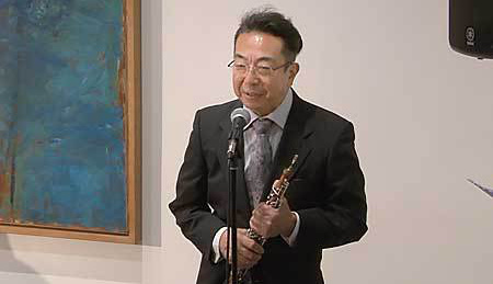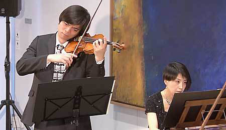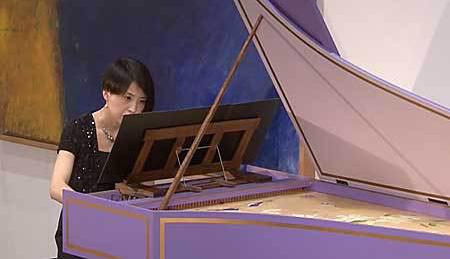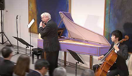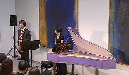 二部スタート。はじめに、上薗さんよりチェンバロについて解説がありました。きょう初めて弾かせて頂くチェンバロは、フィンダ志保子さんが今回のコンサートのために日本で製作家さんを探して下さったもので、製作家さんが何ときょう滋賀県から持ってきてくださいました。皆さんはよくチェンバロはピアノの前身と思われていますが、そうではありません。ピアノは弦をハンマーで叩く打楽器といえます。オルガンはパイプに風を送って音を出しますので管楽器、チェンバロは弦を弾いて音をだしますので弦楽器(厳密には「撥弦楽器」)となります。ギターやハープも同じ仲間(撥弦楽器)です。チェンバロは14世紀頃に発明され、最も古い15世紀のものがドイツに現存しています。現在のチェンバロで、弦をはじくものはプラスティックですが、当時は鳥の羽の軸を使っていました。その鳥は主にカラスだったそうです。