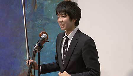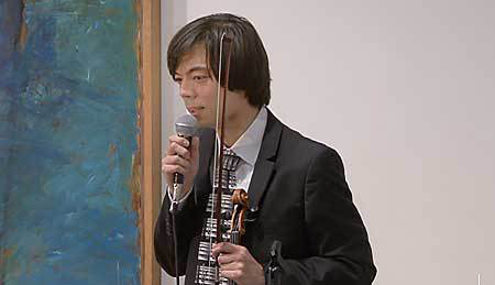 次はチェロの三河 慶史郎さんのMCです。三河さんは、いつも7時半にNHKニュースが終わって、クラシック音楽が流れるときは食卓の音楽として聴かれているそうです。次の曲の「ターフェルムジーク」とは、「食卓の音楽」という意味です。現代のようにハイテク機器がありませんので、このような音楽を、食事のときに貴族など身分の高い人が生演奏で聴いていました。皆様にはリラックスしていただいて、この曲はどんな料理にあうかなぁ?などと思いながら聴いてみてください。