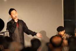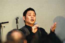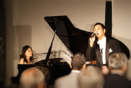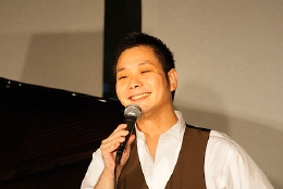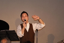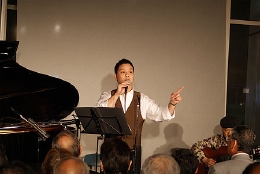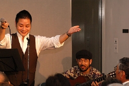 今宵は前半がカンツォーネ、後半がシャンソンとタンゴという構成で、声楽家のKazzmaさん、ギタリストの福島久雄さん、2月のコンサートでもご出演頂いたピアノの渡辺愛さんをお迎えしました。演奏中はKazzmaさんが司会を兼ね、元気いっぱい、旺盛なサービス精神、そして何よりそのパワフルな歌声が印象的でした。