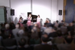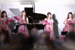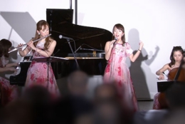 女性のクラシックユニット‘eclat(エクラ)’の皆さんです。「eclat(エクラ)」はフランス語で「輝き」という意味です。出演者の皆さんはその言葉にぴったりの素敵な女性達です。ソプラノの橋本朗子さん、フルートの真鍋知子さん、チェロの田中愛さん、そしてピアノの浅川真己子さんによるユニット構成です。曲目内容は、クラシック、映画音楽、オペラ、J-POP、唱歌、タンゴと実に幅広く、どれもお客様になじみ深い曲ばかり。それをeclat流のアレンジを加えて、また違った味わいに変えているところが秀逸でした。