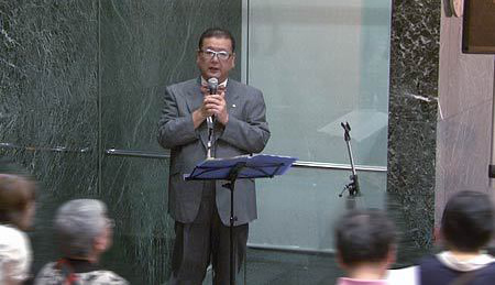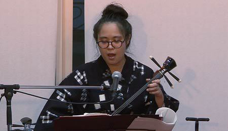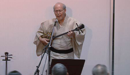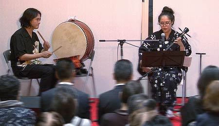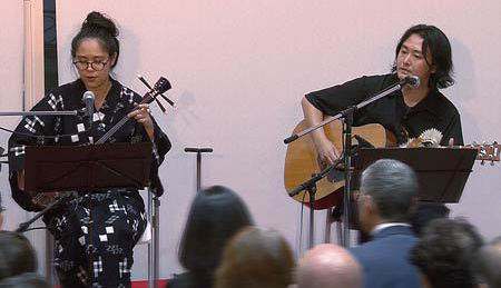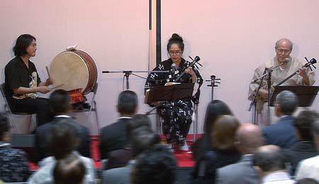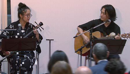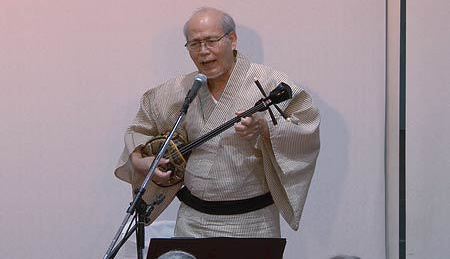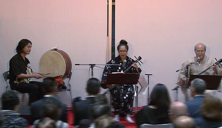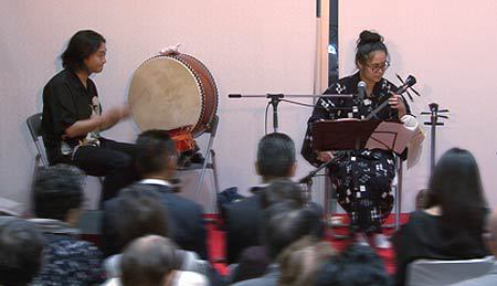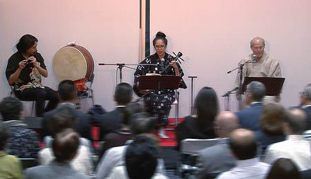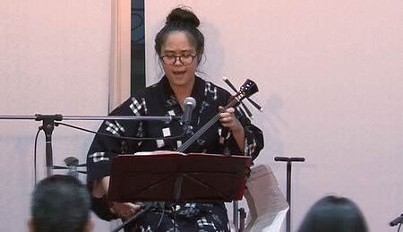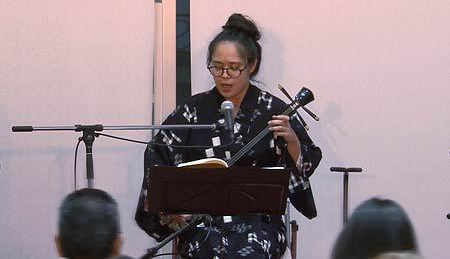 さて、今回は当コンサートではじめての沖縄民謡となります。三線と唄の頭金愛子さん、同じく三線と唄の兼城克夫さん、そして太鼓の頭金周介さんをお招きしました。実は兼城克夫さんは頭金愛子さんのお父上で、頭金周介さんは愛子さんのご主人であり、大変息の合った唄と演奏を聴かせていただきました。