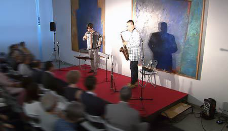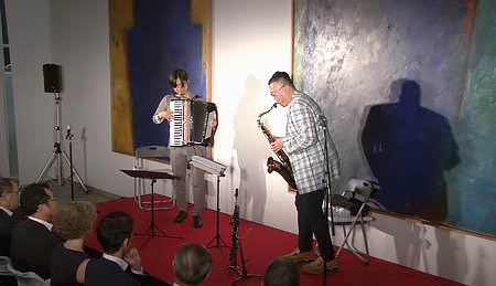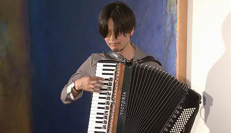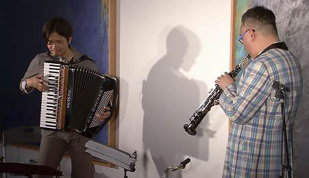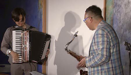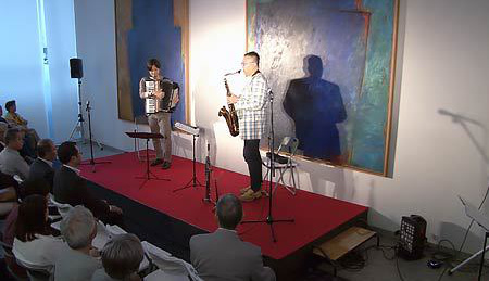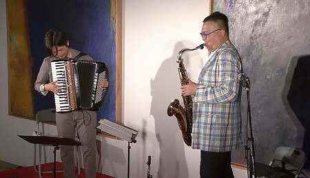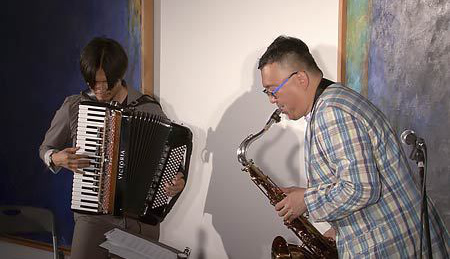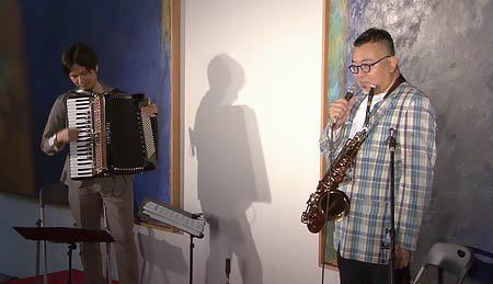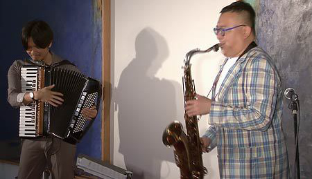 さて、今宵のコンサートはサックスの田中邦和さん、アコーディオンの佐藤芳明さんをお招きして、ジャズのスタンダードナンバー、映画音楽そしてシャンソンなどを演奏していただきました。お二人の演奏はとても独創的でユニークな印象を受けました。二つの楽器をまるでパーカッションのように使ってみたり、サックスのネックの部分を取り外し、ネックを和楽器の笛のように吹いてしまったりと聞いているお客様も大変驚かれているようでした。