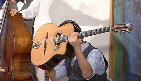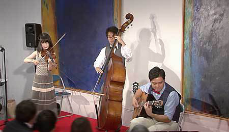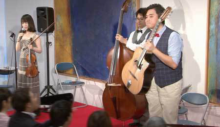 ヴァイオリンとMC担当のruriさん、マカフェリ・ギターとバンジョー担当の加々美 アレンさん、そしてコントラバスの杉山 祐一さんによる編成です。(※マカフェリ・ギターについては、初めて聞いたというお客様も多いかと思いますが、通常のギターより太めでヴァイオリンやコントラバスに負けない大きな音が出せる、ジプシージャズ専用のギターです)。
